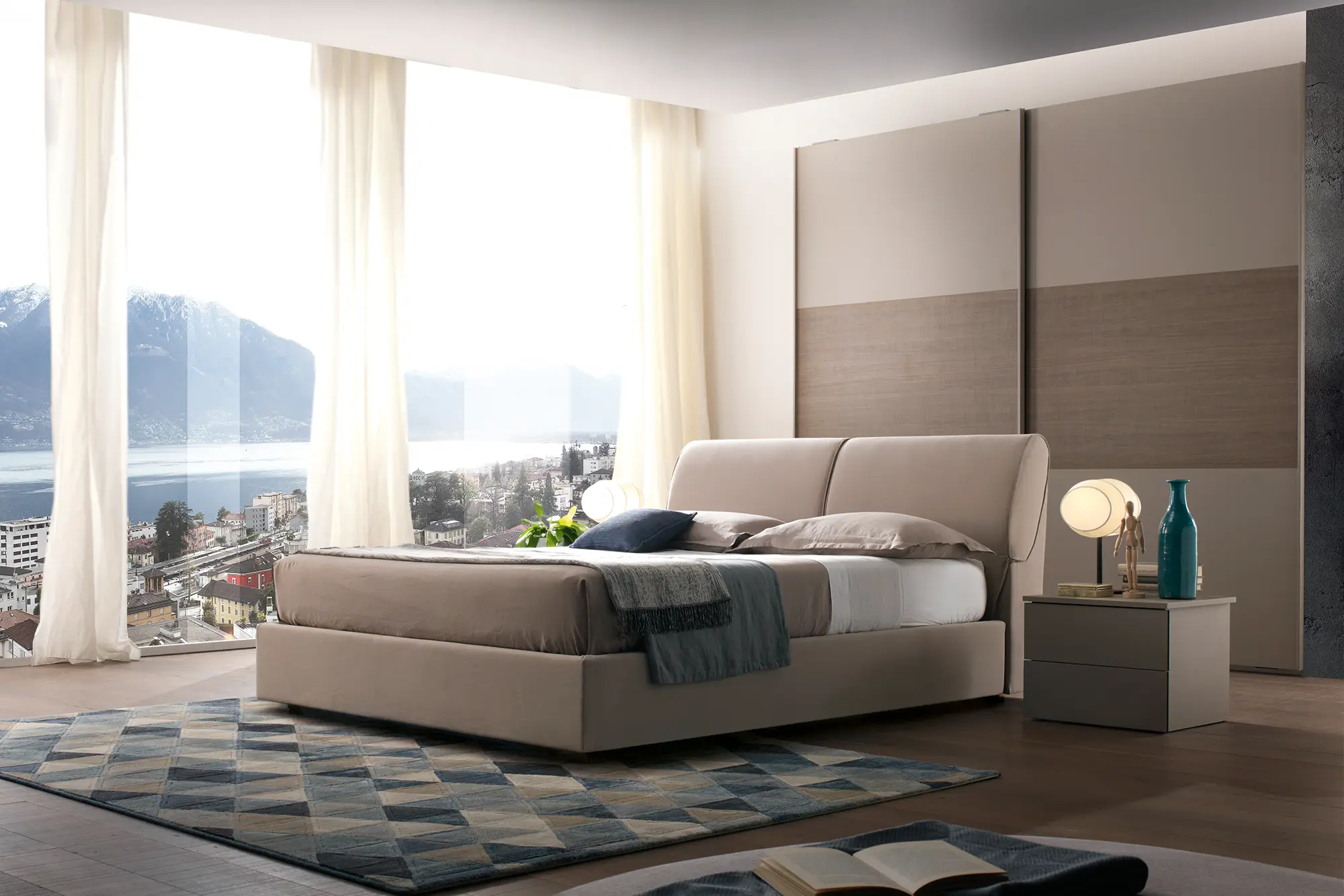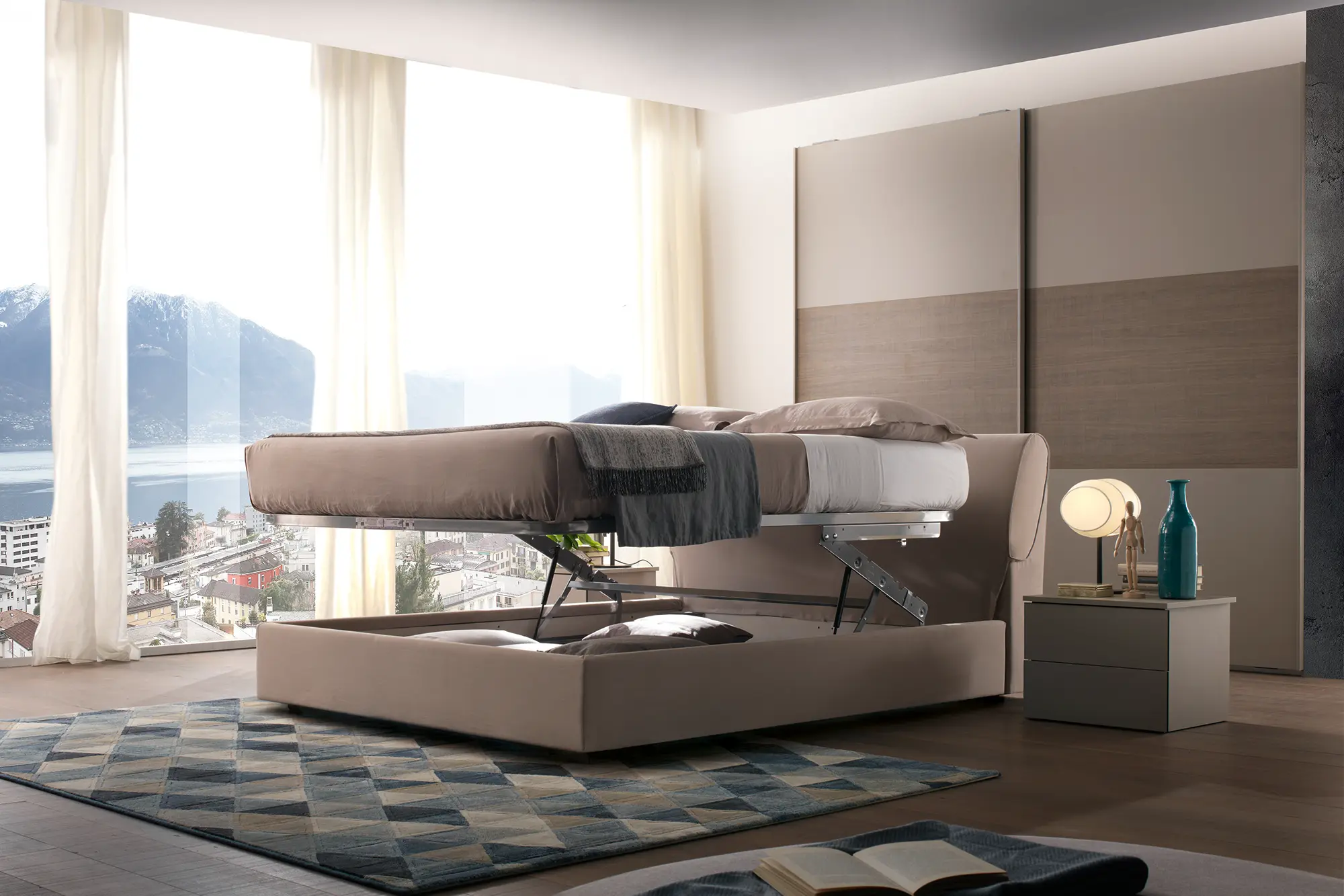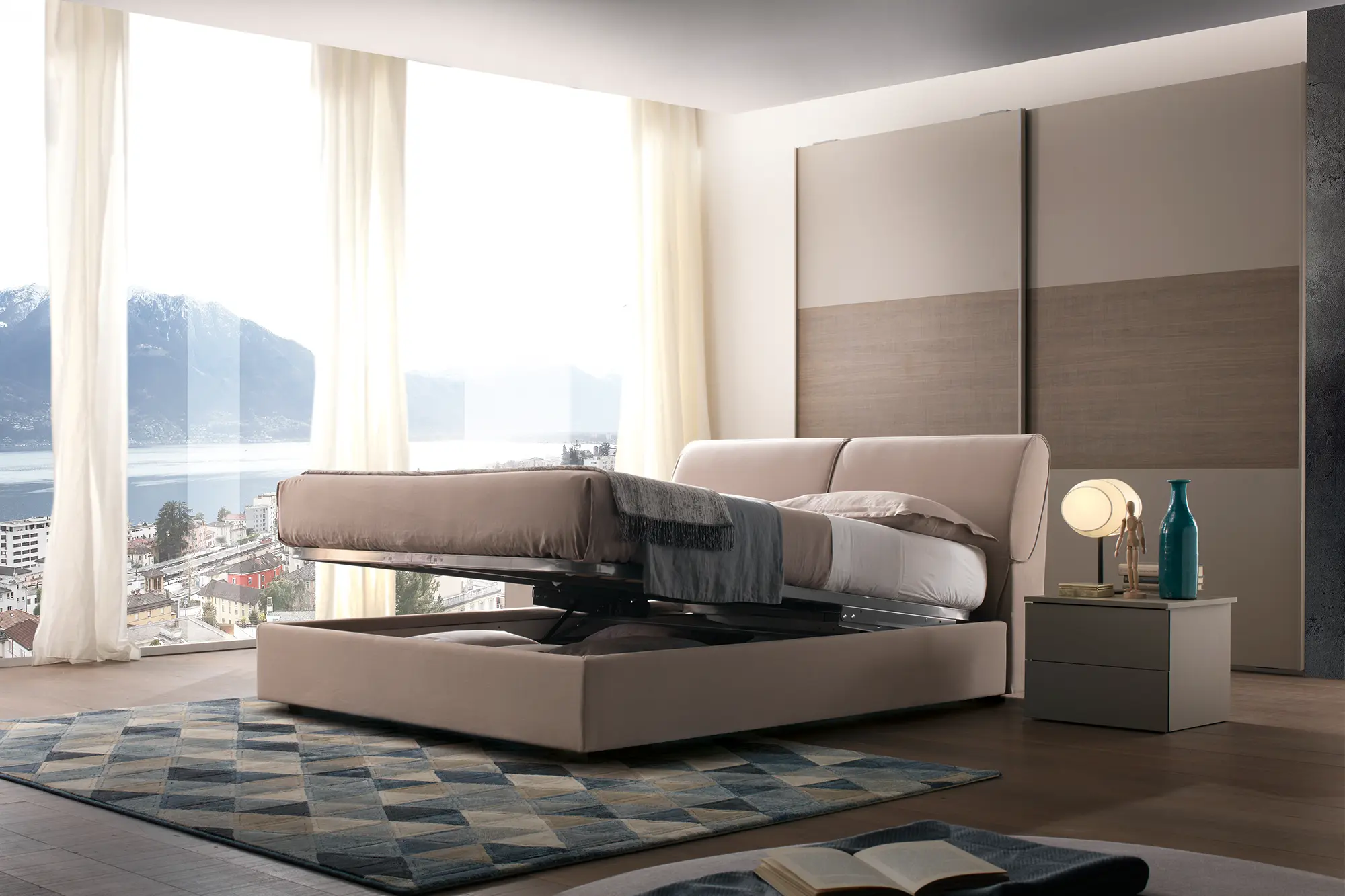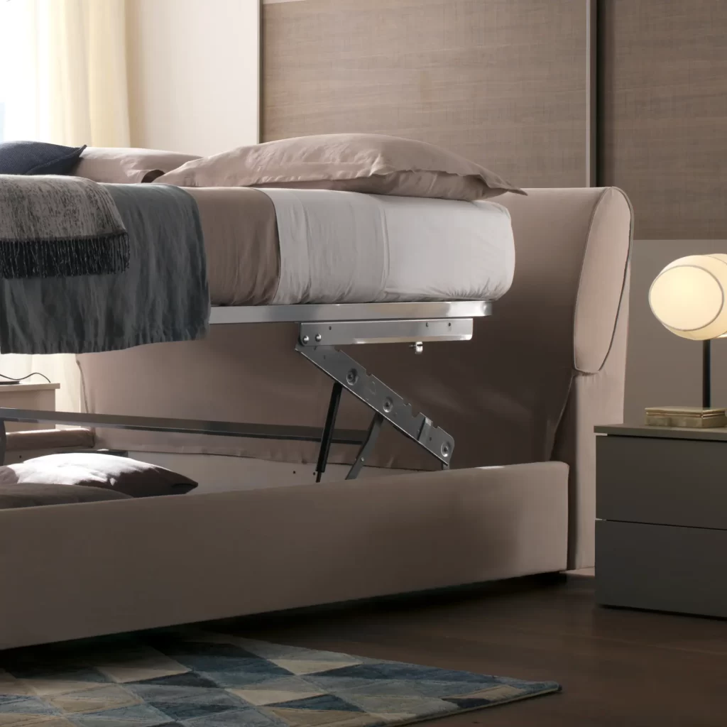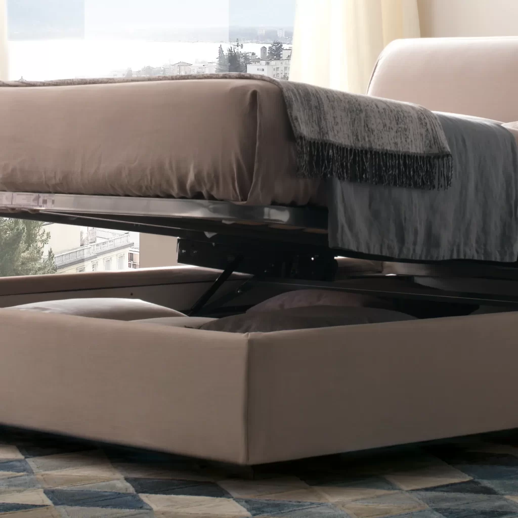 Cama com formas sóbrias e lineares é caracterizada por uma cabeceira prática e funcional com arrumação para as almofadas. Milos é projetada para oferecer a todos um descanso ótimo tendo em opção arrumação na base.
